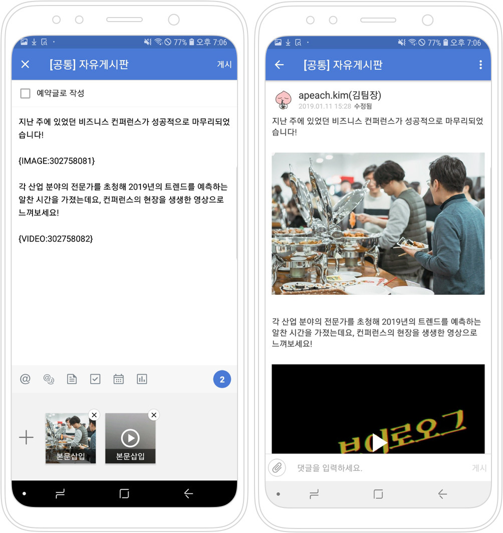 그룹에 글을 작성할 때, 사진 및 동영상 파일을 글 중간에 삽입할 수 있습니다.